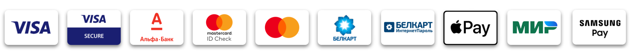 К оплате принимаются карты международных платежных систем VISA, MasterCard, платежной системы БЕЛКАРТ. Оплату также можно совершить посредством сервисов Apple Pay, Samsung Pay.